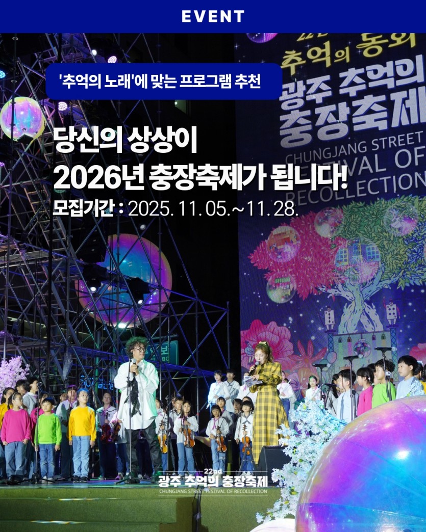 2026년 제23회 광주 추억의 충장축제는 '추억의 노래'라는 주제아래 다시한번 시민여러분과 함께하고자 합니다.