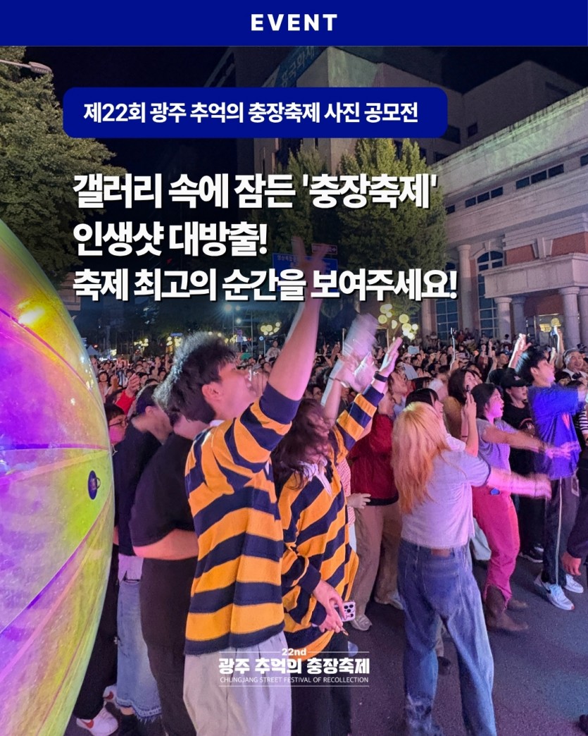 『제22회 광주 추억의 충장축제』기간 중 시민들이 직접 촬영한 축제사진 공모전을 진행하오니 많은 참여 바랍니다.