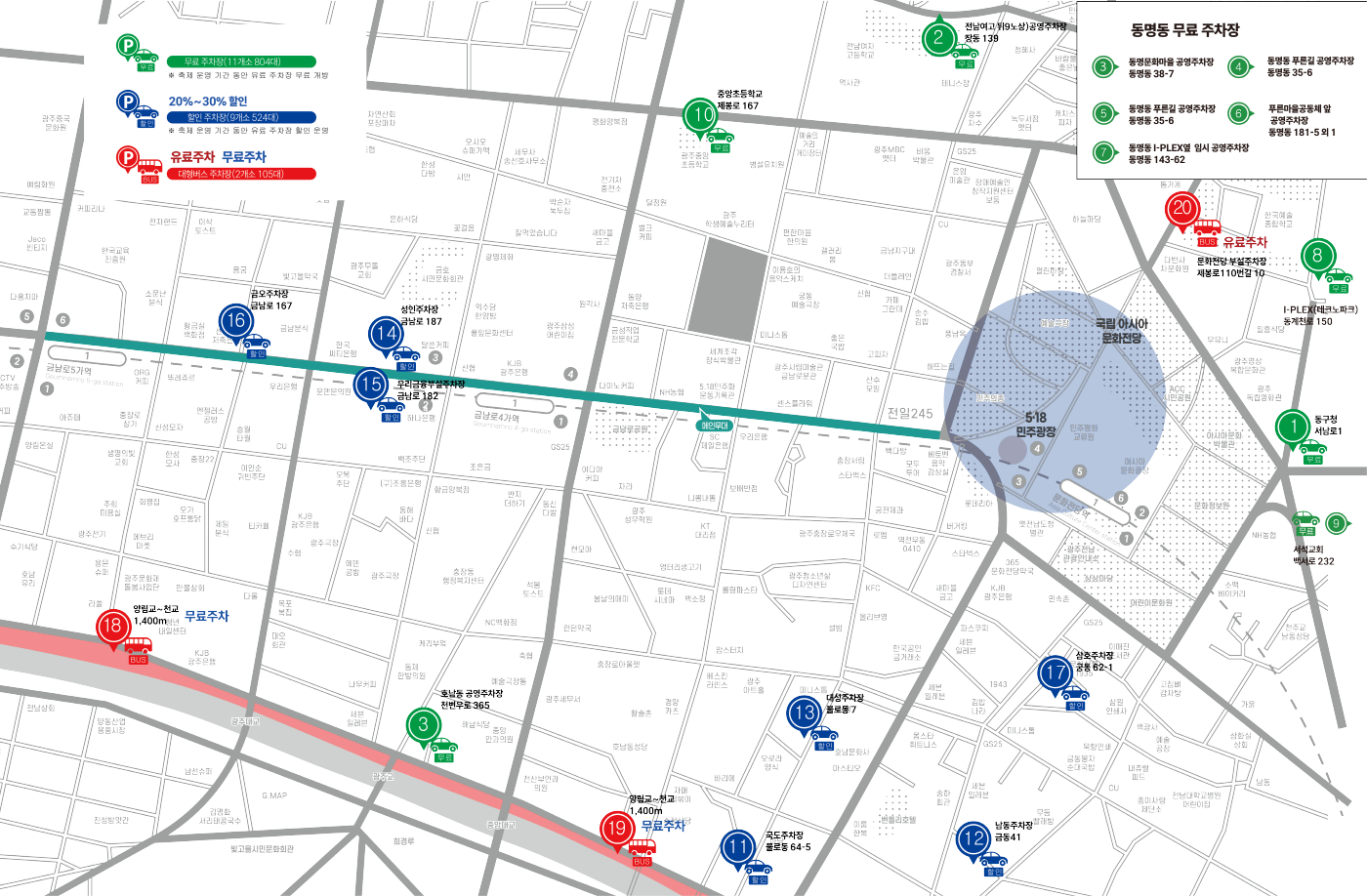 ※3. 호남동 공영주차장은 충장라운지(종합안내소)에서 주차권에 도장 받아 올 경우에만 무료로 이용가능!- 1 동구청 (서남로 1)